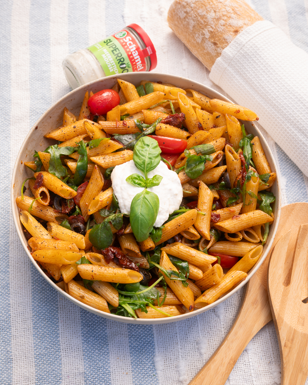 4. Nudeln mit Cocktailtomaten, getrockneten Tomaten & Oliven in eine große Schüssel geben.